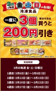 500円の冷凍食品3個買って200円引きじゃ大したことなくても、金額低めのヤツ3個買った時の割引率がエグイんですよ。